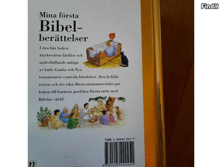 Tjock bok i nyskick med guldband, bibelberättelser.