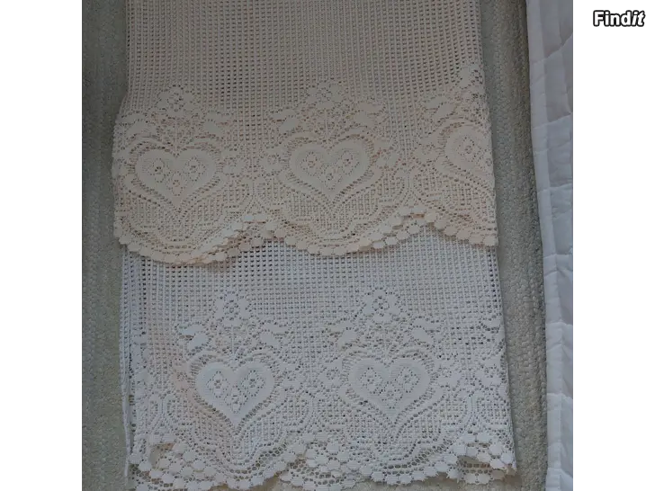 Virkade gardinkappor, 240x60cm, 45€ st. Säljes tillsammans eller enskilt. Den ena vit och den andra har en lite gulare nyans.