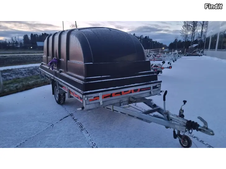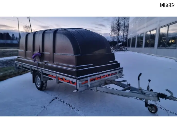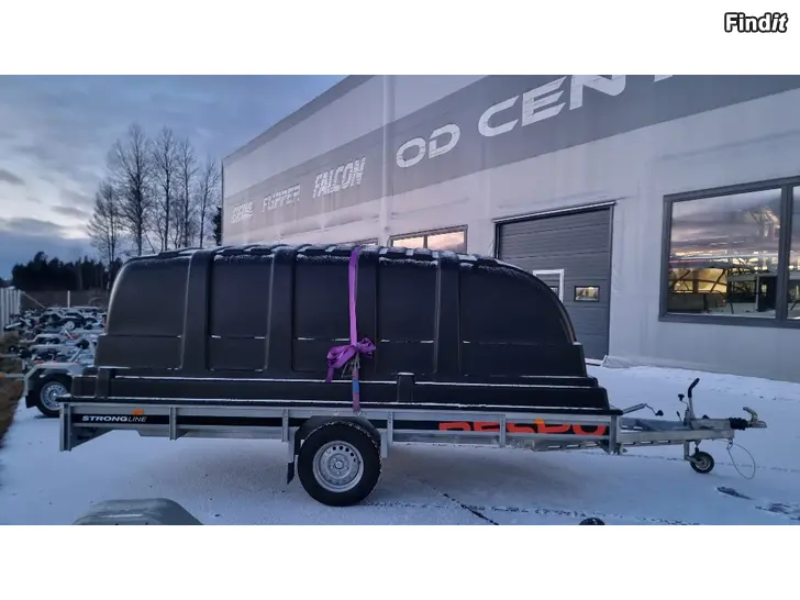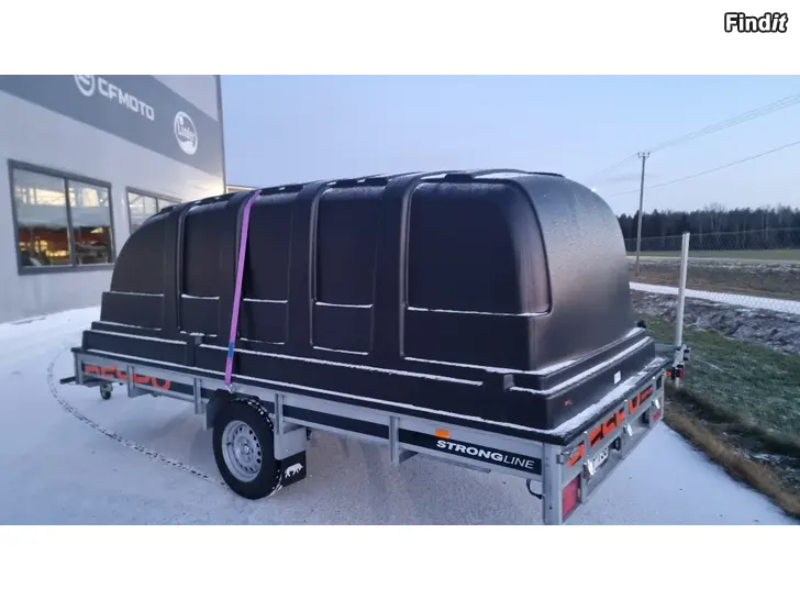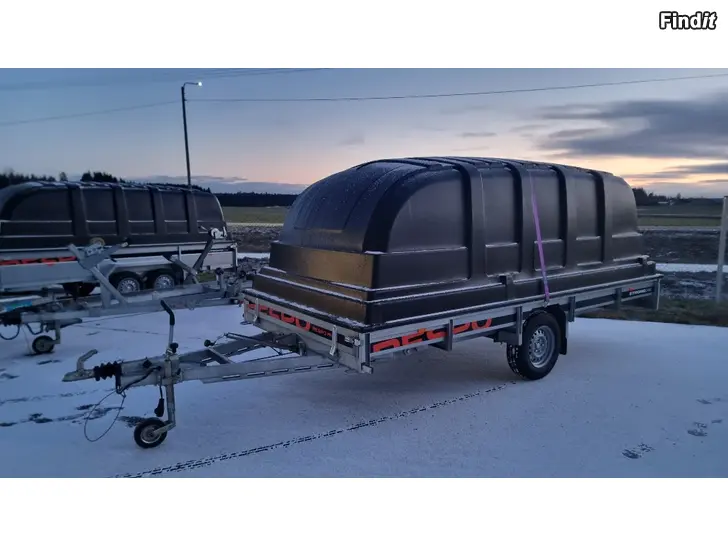 Utvecklad specifikt för transport av snöskotrar, fyrhjulingar samt andra liknande fordon. En praktisk egenskap är den låga lämhöjden. Skärmarna är plastbelagda och belastar inte skoterns skidor. Tipp-skruv möjliggör kontrollerad öppning och stängning av flaket. 4-bladiga bladfjädrar, stötdämpare och vattentäta lager garanterar bästa köregenskaper. Den väderbeständiga bottenplywoodens beläggning är UV-beständig. Ett släp som lämpar sig för nordliga, krävande förhållanden!