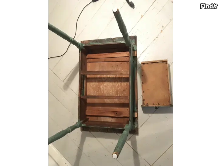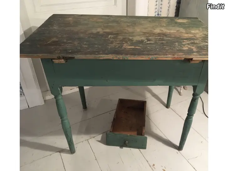 Allmogebord 57*91 cm skiva, höjd 71 cm från 1800 talets slut. Lådbotten utbytt samt spricka på lådfronten. Bordet har omgjorts till klaffbord i ett senare skede men nu finns inte sidoklaffarna mera, därav extra förstärkning med trästycke undertill i bordsskivan. Skivan härligt grönpatinerat. Fås till närregionen eller hämtas från Kronoby, Hofsala.
