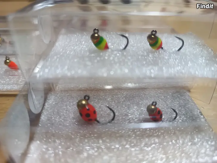 Nytillverkade isfiskebeten finns allt från storlek 12 till storlek 6, enkelkrok och trekrok, pris från 5 euro styck, handgjorda kvalitetsbeten tillverkade i kust Österbotten, förtyngda med tungsten så de är 100 blyfria