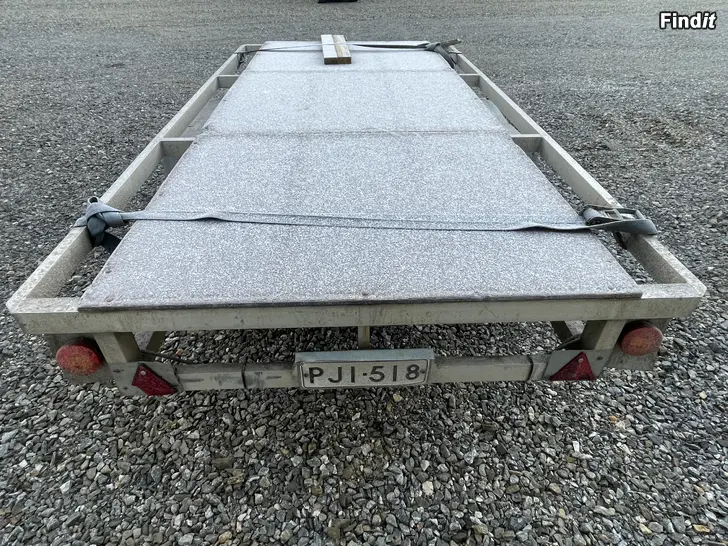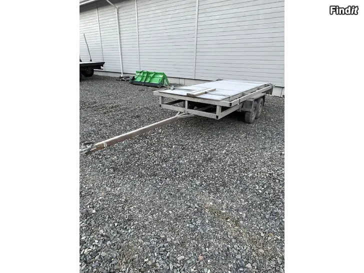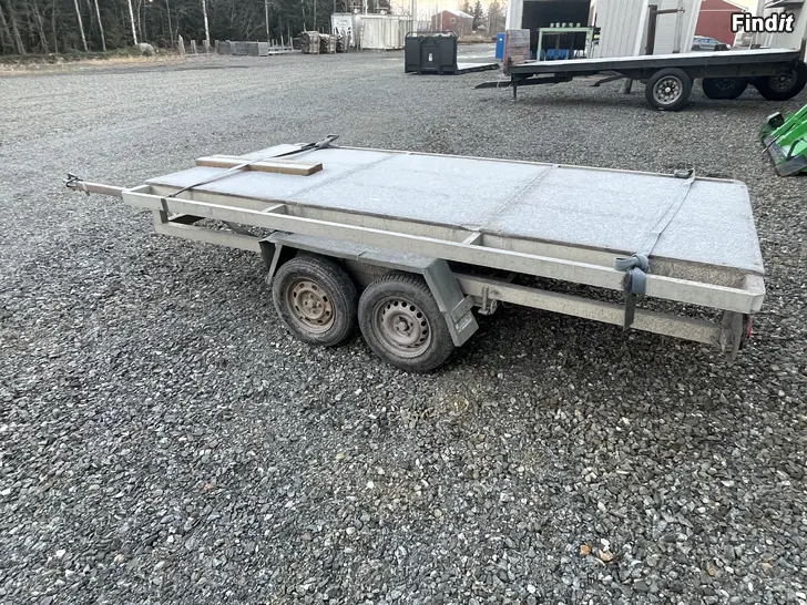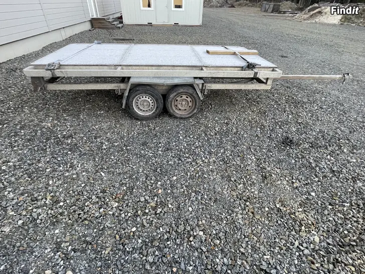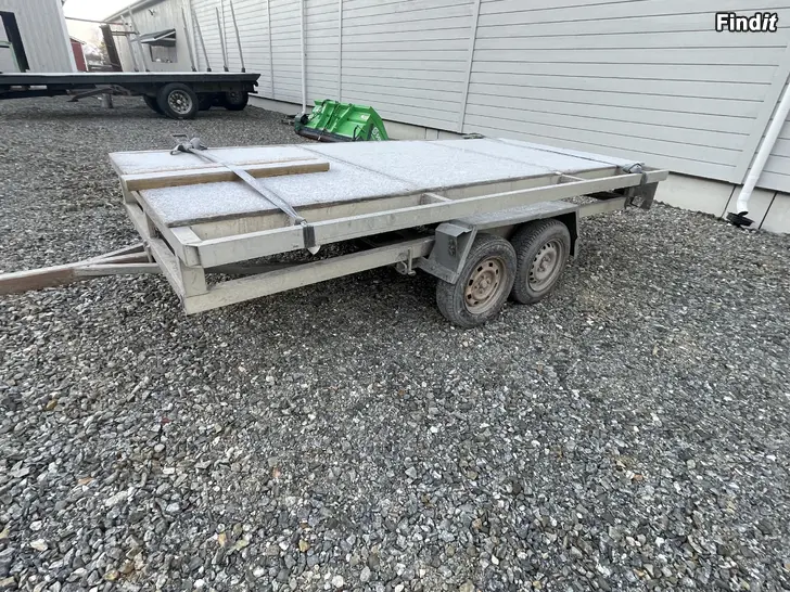 Robust bilvagn med lång dragbom. Stadig botten med fästpunkter för lastsurrning längs hela vagnen.