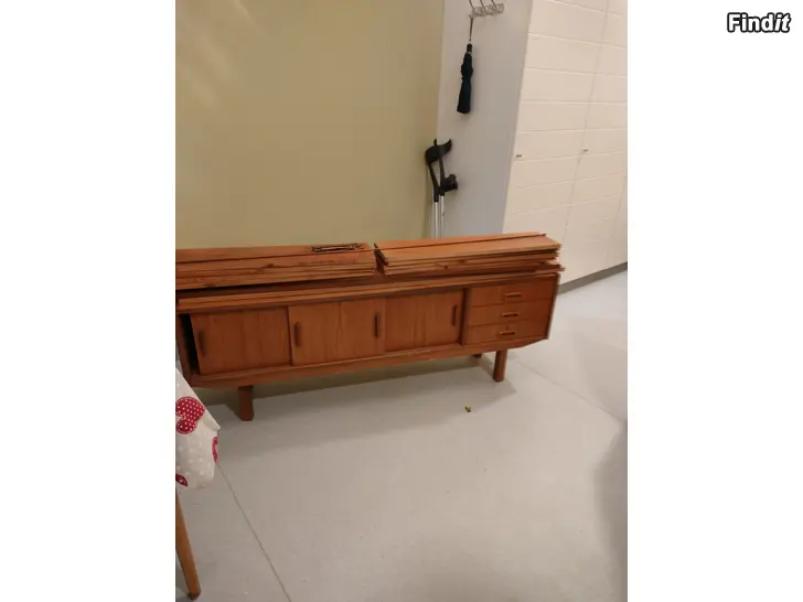 Bild 2: Bokhylla längd ca 150cm, skåpdel höjd 54cm, djup 35cm. Skåpdelen består av 3 skjutdörrar från vänster, till höger 3st lådor. Överdelen består av hyllplan. Pris 60€