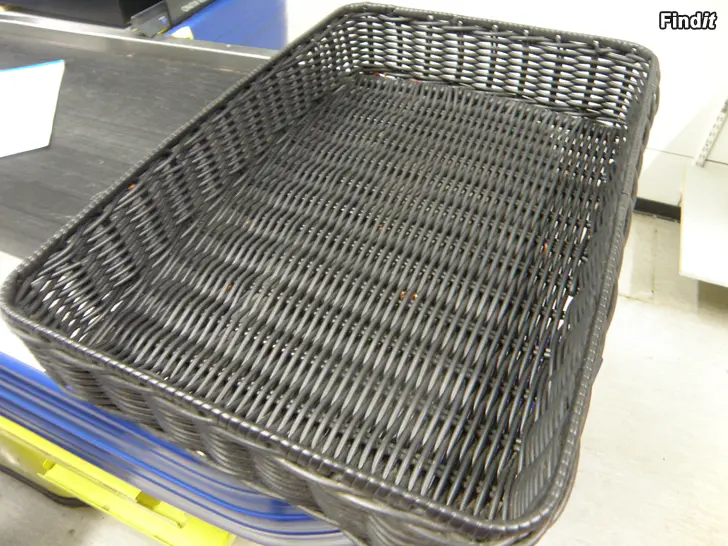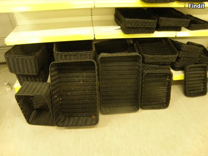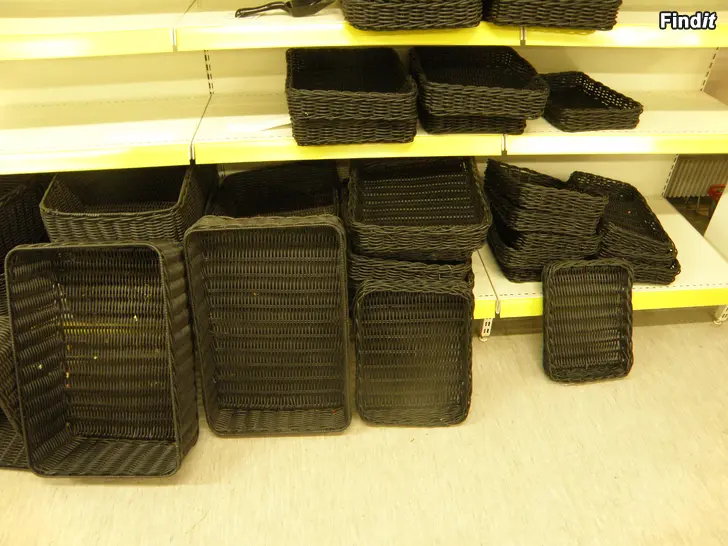 Säljes ett stort antal plastkorgar rottingmodell som använts i butik. Flera storlekar. Pris: 40x29x7 8,00, 40x30x20 10,00, 44x32x7 11,00,