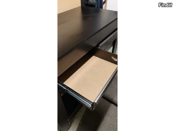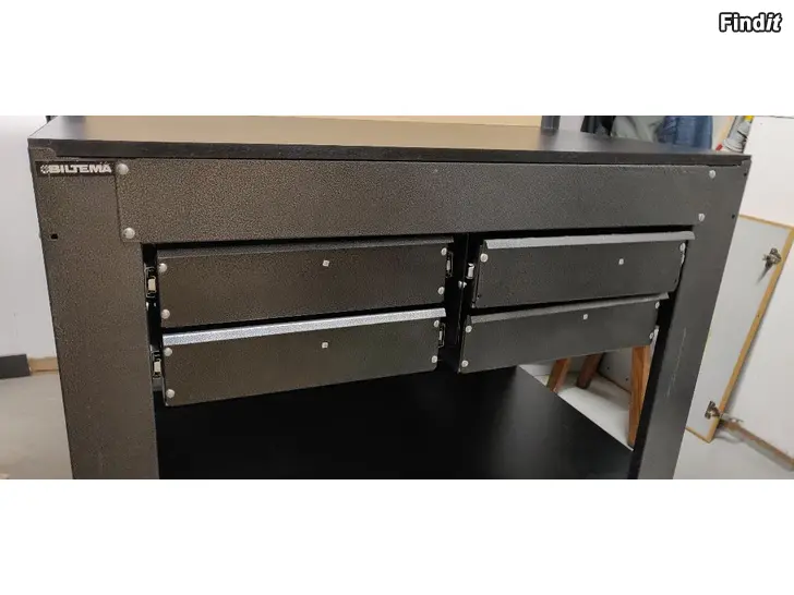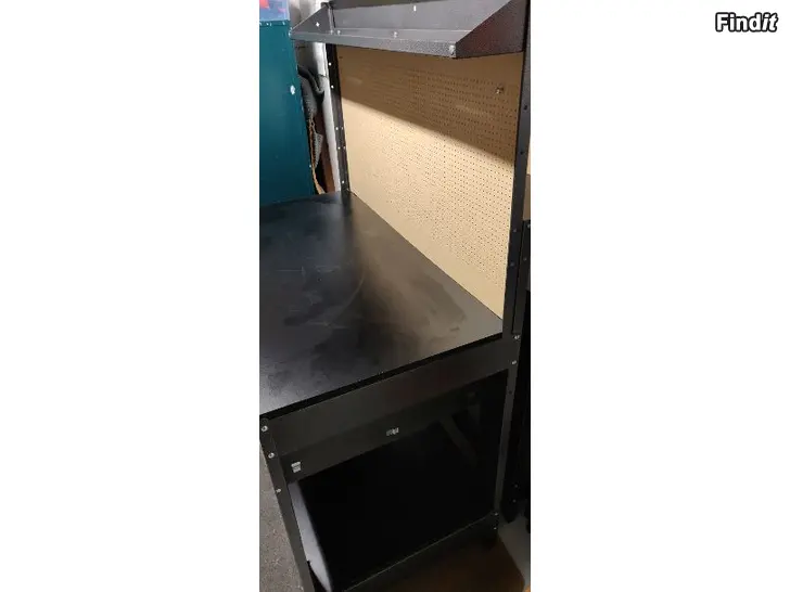 Biltema arbetsbord, nästan oanvänd, metall ram med 4 st lådor, övre/nedre hylla och hålvägg för arbetsredskaps fastsättning. längd 114 cm, höjd 160 cm, bredd 60 cm, bordsytans höjd 90 cm.
