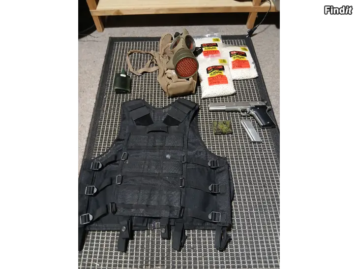 Säljes helst allt på en gång till förmånligt paketpris ingår: - Väst med mycket fickor/fodral - Airsoftpistol - 3x 3700 airsoftkulor - Gasmask med fodral - Behållare för airsoftkulor - Maskeringsfärg - Skyddhjälm av mycket bra kvalite
