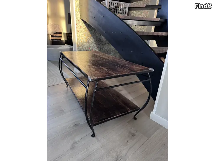 Soffbord i rustik stil säljes. Stadigt med metallram/ben. Syns en del spår av användning på ytan men går att slipa och måla. Har nu på kantskydd för barn men dessa går att ta bort. L100xB49xH47cm.