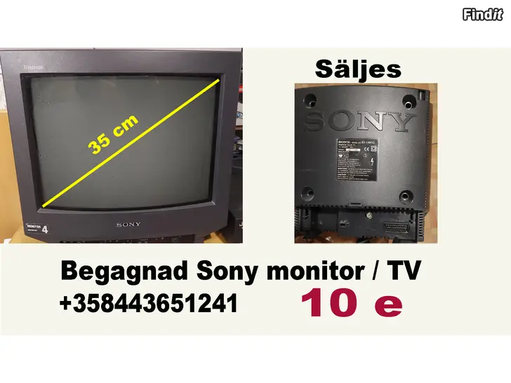 Säljes begagnad Sony monitor / TV. Fungerar. Pris 10 e. Finns i Malax. +358 44 3651241