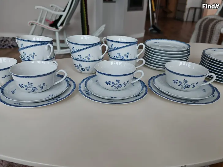 Säljer en mycket vacker och tidlös te servis från Fyrklövern för 12 personer. Modellen Blå Herrgård. Servisen är i absolut nyskick, helt utan nagg eller slitningar. Setet innehåller 12 st assietter, 12 st fat till kopparna, 13 st koppar. Perfekt för bjudningar eller som en elegant vardagsservis. Postar ej.