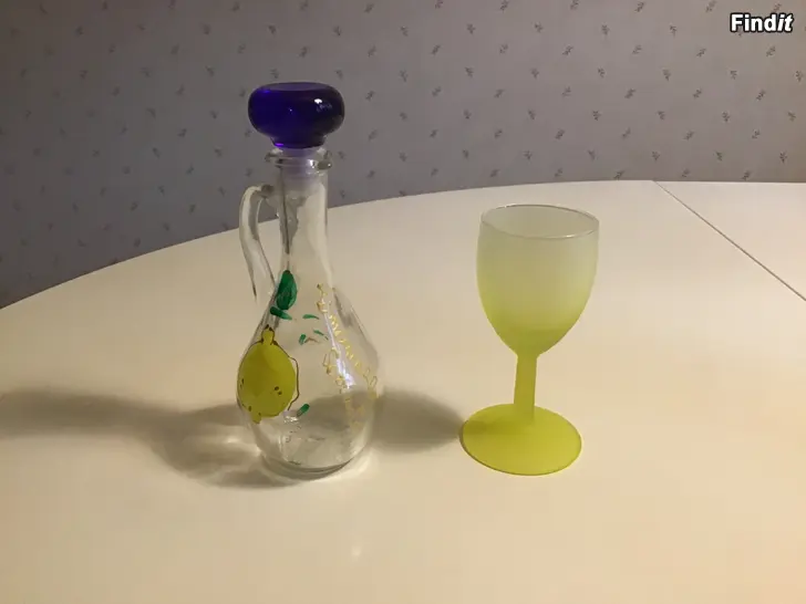 6 st Italienska likörglas på fot i Originalförpackning 4 st trevliga italienska flaskor, 3 st större och en mindre vacker Limoncello flaska/karaff Allt för 5 euro. Kontantbetalning. Finns nära Minimossen
