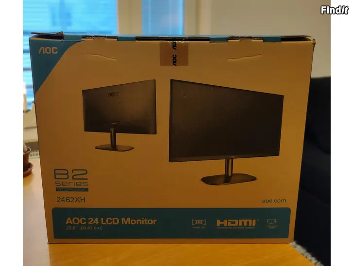 Fullständigt oanvänd AOC 24B2XH 23.8 tums monitor, jag har haft den i skåpet som extra monitor i fall nån av mina primära hade gått sönder, men eftersom jag ska beställa allt nytt så har jag inte längre behov av den. Enda gången den har varit ur förpackningen är för att ta kort för denna annonsen och för att testa så den fungerade innan jag sålde den.