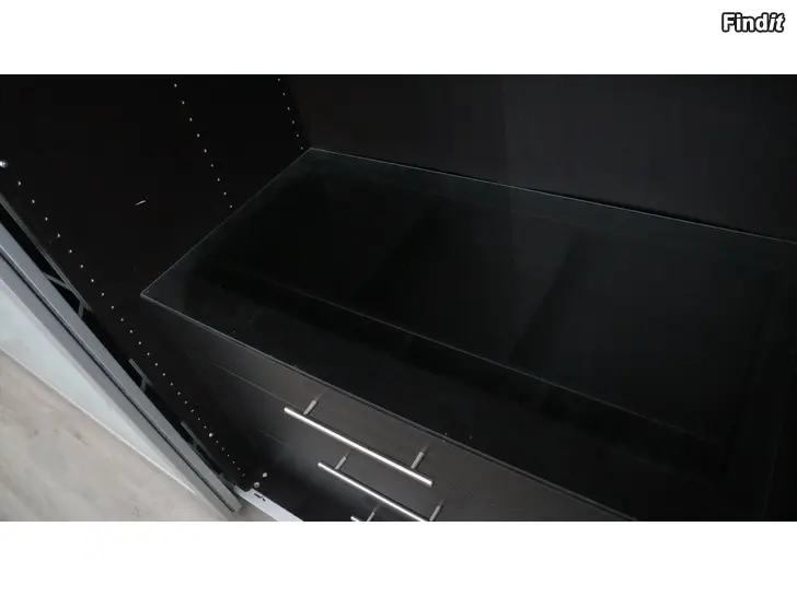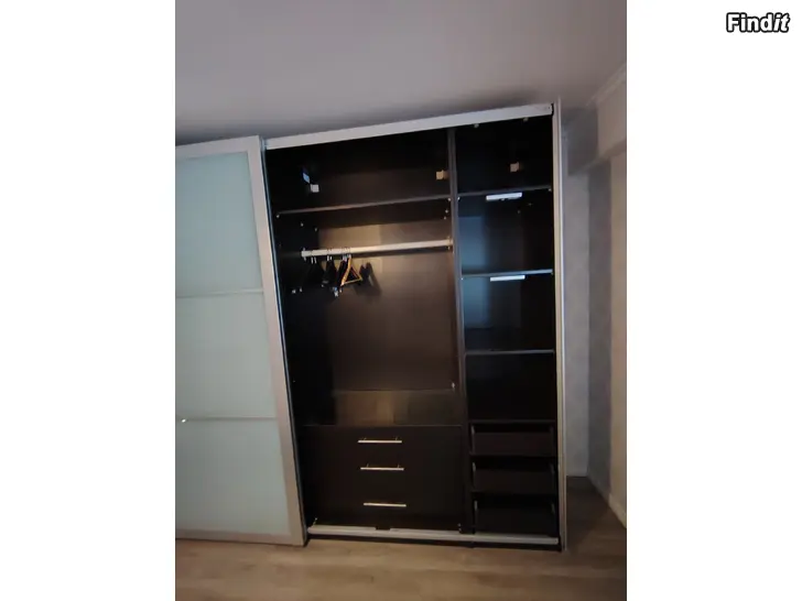 Inredning som ingår: Två stora skjutdörrar i frostat glas med aluminiumram. 3 st breda lådor 100 cm 3 st smalare lådor 50 cm 2 st trådkorgar 50 cm Klädstång, samt flera hyllplan.