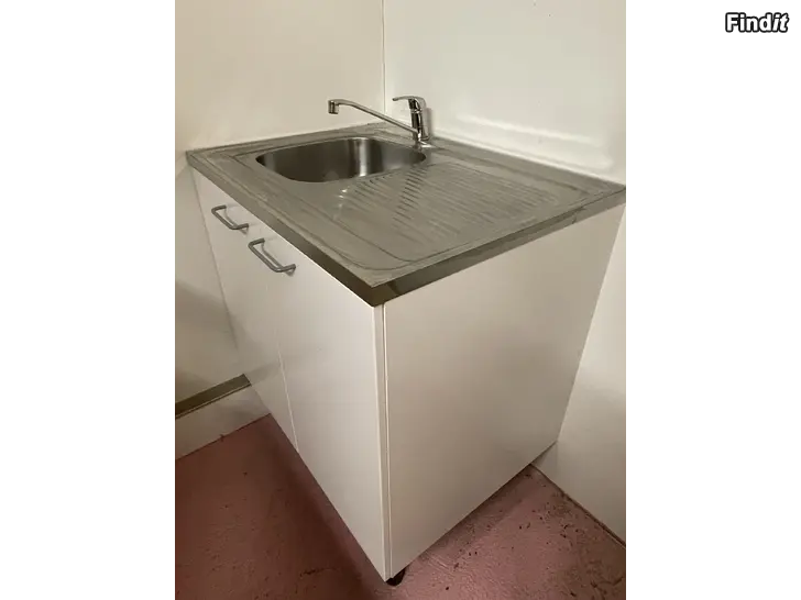 Diskbänk med skåp, stanklås och blandare. Har bara blivit använd som avställningsyta och varken vatten eller avlopp har anslutits. Mått 80x60 cm. Endast ett ben finns och ingen hylla i skåpet.