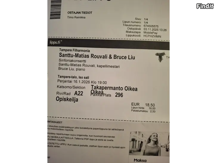 1 x opiskelija 18,50€ rivi A22 paikka 296