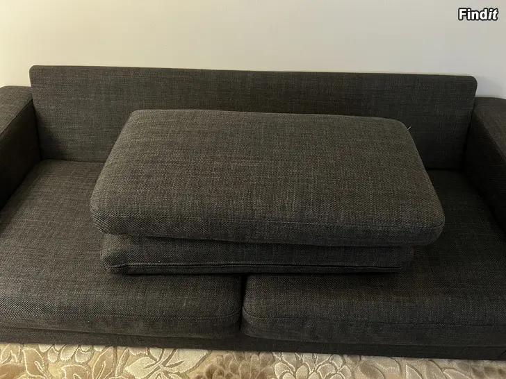 I gott skick! Mjuk och bekväm. Ryggkuddarna är avtagbara och det finns dragkedja så att man kan tvätta dem. Jag säljer alla mina heminredningssaker eftersom jag flyttar, så om du söker något till hemmet kan du fråga om jag har det. Mattan som syns på bilden är också till salu och finns på min profil. Behöver sälja senast 14.2.