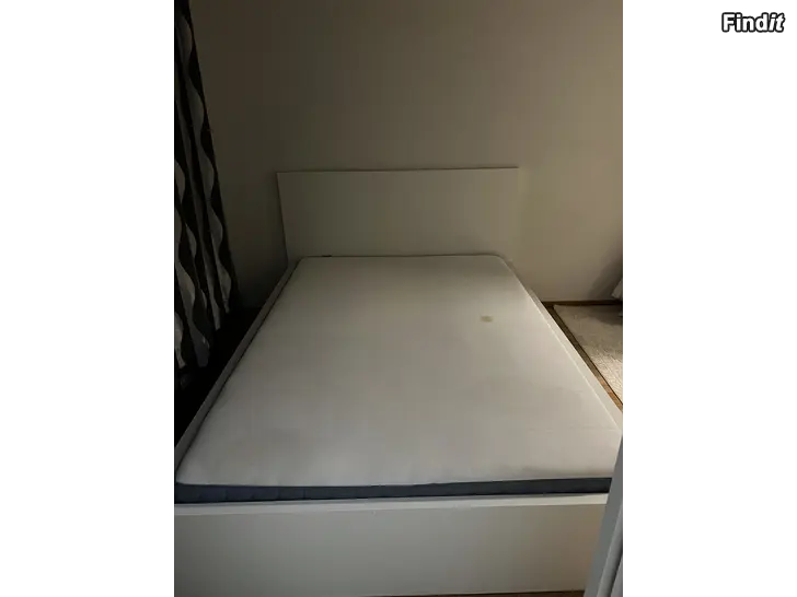 IKEA-säng och madrass. På madrassen finns fläckar, som t.ex. från cola och från när jag flyttade, men annars är allt okej. Madrassen är bekväm. Sängens storlek är 140 × 200 cm.