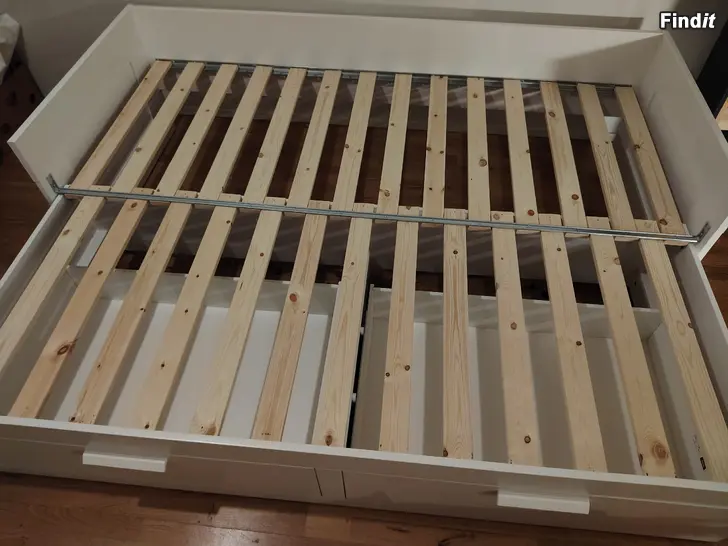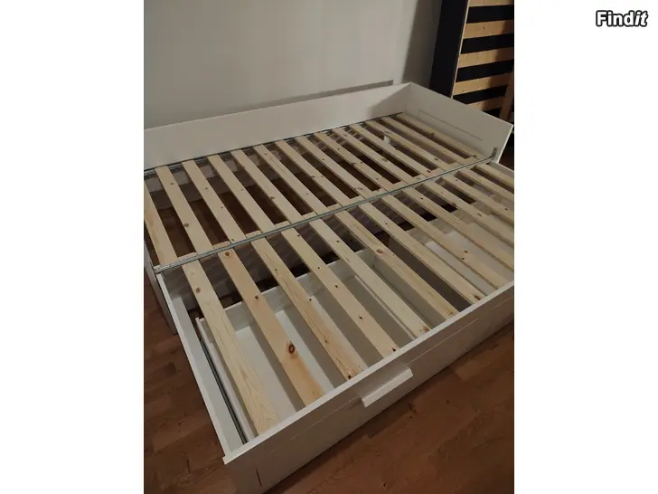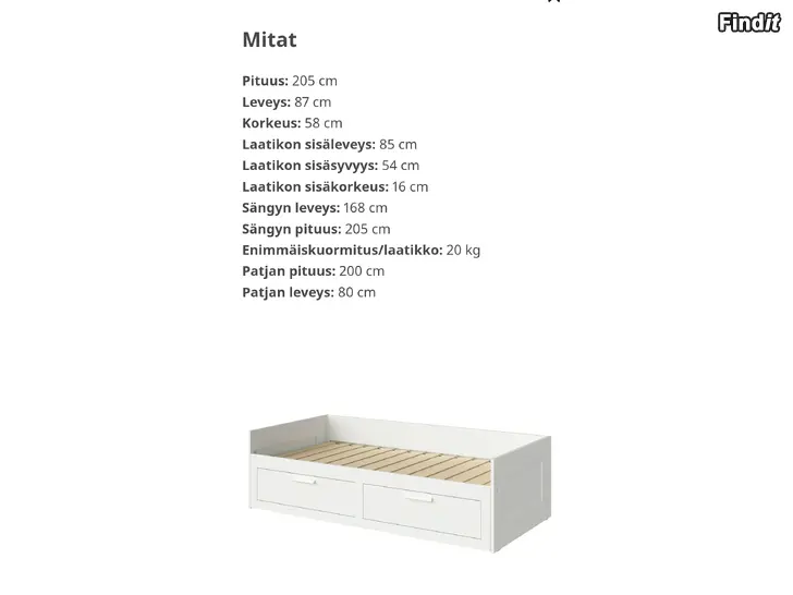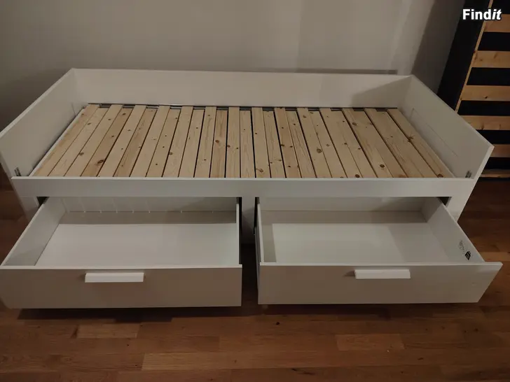 Levitettävä sohvasänky, mitat kuvassa. Ikean Brimnes-sohvasänky. Patjan koko on 80x200 cm, menee 1 tai 2kpl, patjat ei kuulu mukaan. Kaksi isoa säilytyslaatikkoa. Uudenveroinen ja hyvässä kunnossa.