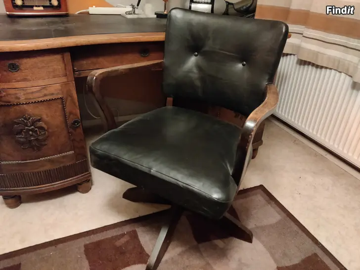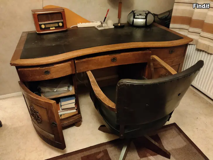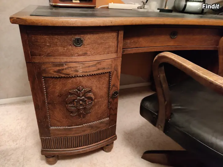 Gammalt antikt skrivbord arbetsbord med läder bordsyta. Läderstol medföljer.