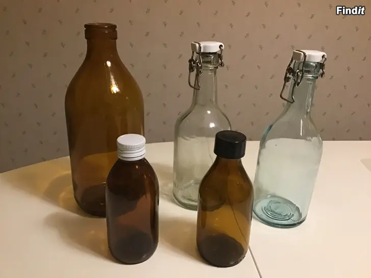 2 st gamla limonad flaskor/Hartwall med porslinskork 1 st liters mjölkflaska i brunt glas 2 st gamla apoteksflaskor Skåpstädning ! Alla fem tomflaskorna för 5 euro ! Kontantbetalning.