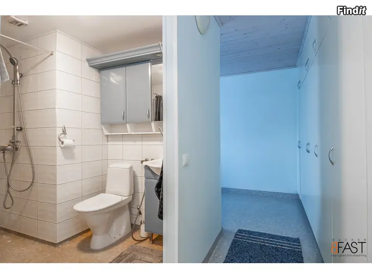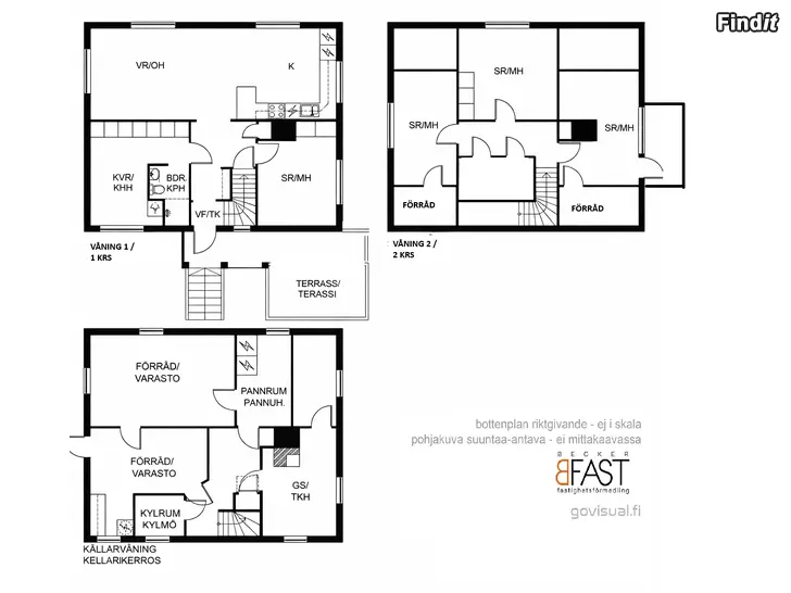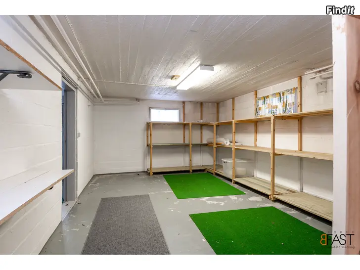 På bostadsvåningen finns kök med matplats i öppen lösning mot vardagsrummet, ett sovrum, badrum samt klädvårdsrum. Övre våningen omfattar tre sovrum, förrådsutrymmen samt utrymme för badrum. Källarvåningen består av brasrum, kylrum, pannrum samt förrådsutrymmen. I anslutning till bostadsvåningen finns en stor terrass samt balkong på övre våningen.