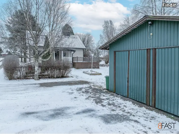 Rymligt egnahemshus i 1½ plan med källarvåning samt separat garagebyggnad på egen tomt om 2 002 m² i Näsby, Närpes, cirka 2 km från Närpes centrum.