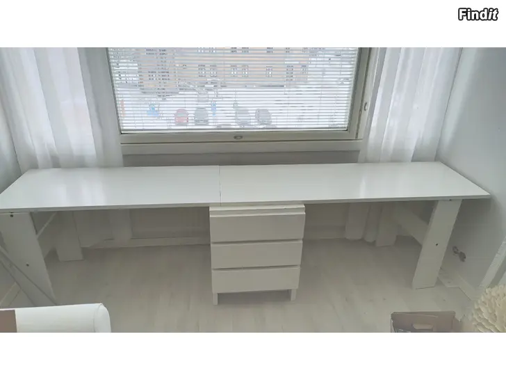 Valkoinen laatikosto + kaksi irtojalkaa ja kaksi pöytälevyä n. 100 cm ja 120 cm.