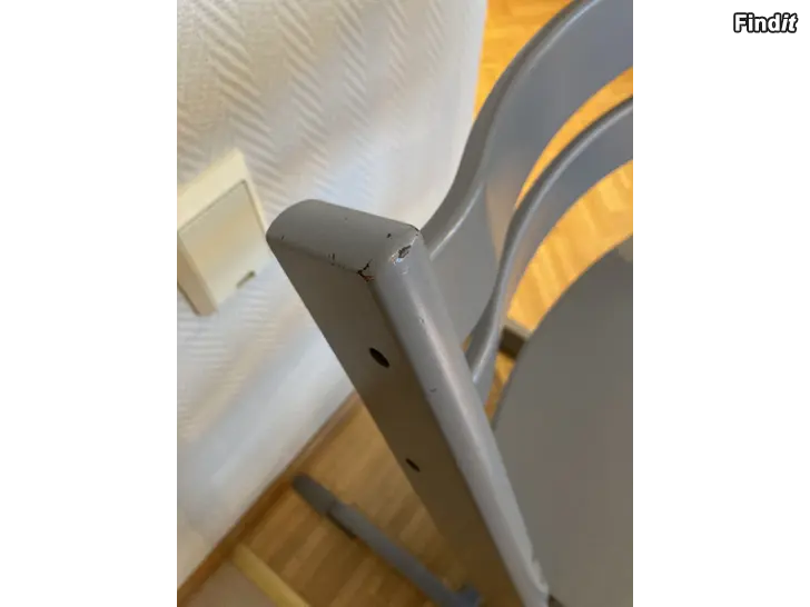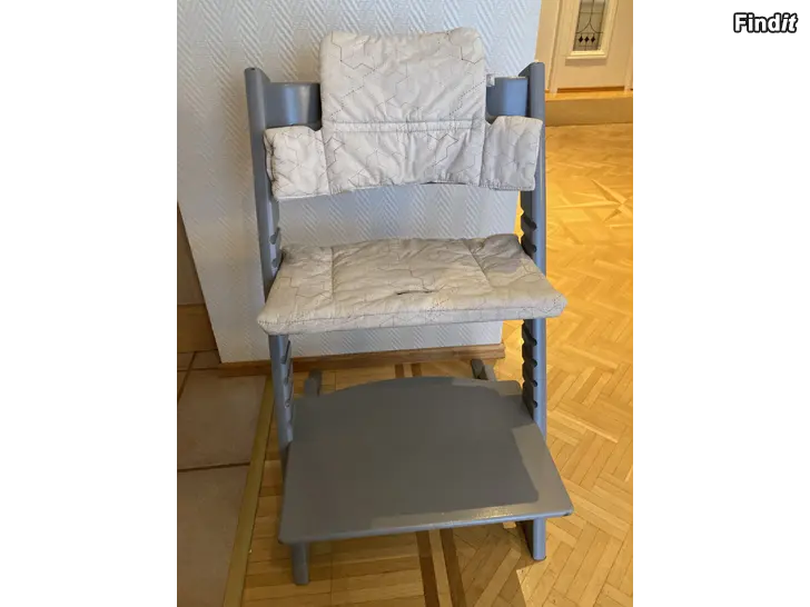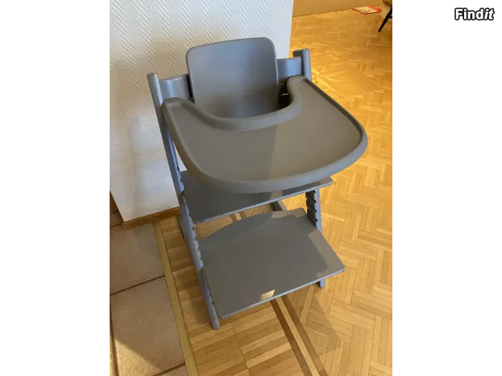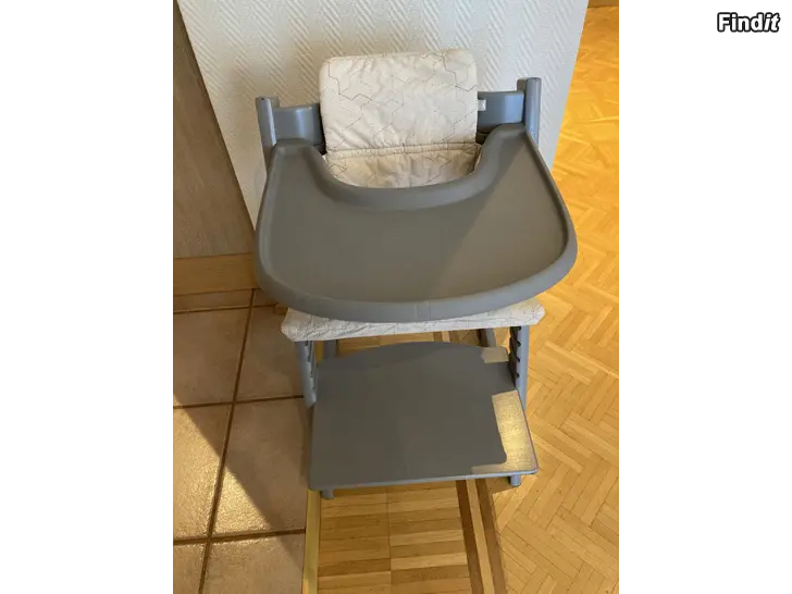 Grå stokke-stol med babyset, bricka, glidare och dyna säljes. I bra använt skick. Finns lite hack/repor i stolen se sista bilden, men den är stadig. Använd av två barn.