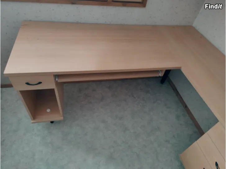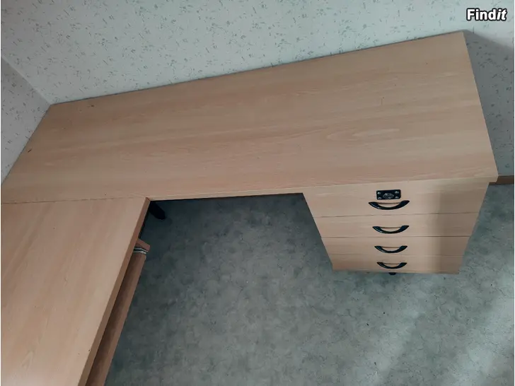 140cm bredd på högra bordsskivan med lådor, 44.5cm djup.