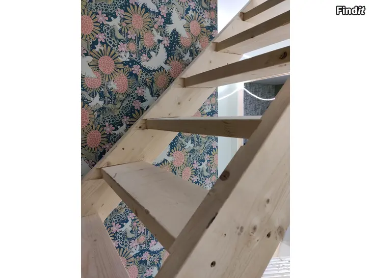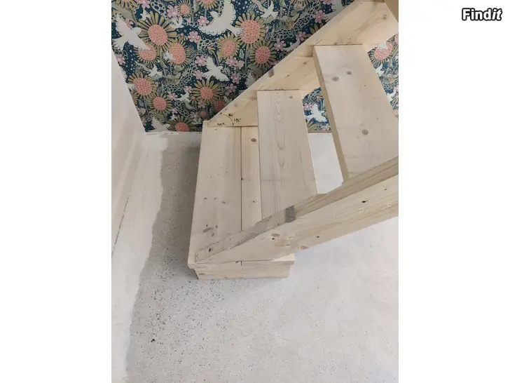 Rak trappa på ca 3,9 m från spets till spets. Bredd: 760 mm. Steghöjd: 195 mm, stegdjup: 230 mm. Stegen är infrästa i vagnstyckena vilket gör den extra stabil. Nedersta steget är löstagbart. Passar bra som tillfällig trappa då man bygger. Passar till en nivåskillnad på 2,8-2,9 m. Hämtas från Koskö.