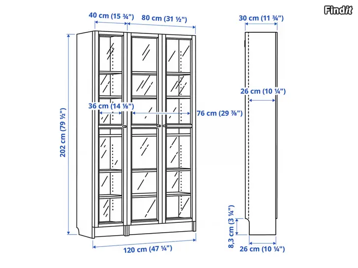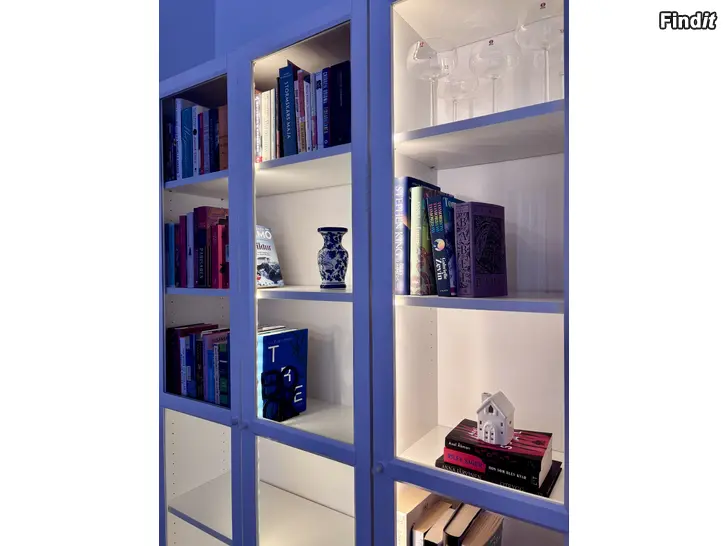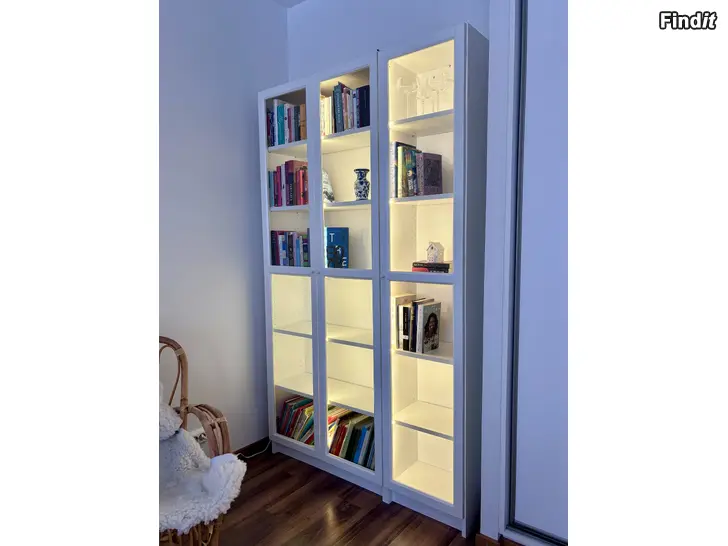 Säljes Ikeas Billy/Oxberg bokhylla med glasdörrar. Ledslingor följer med. I bra skick, spår av användning finns. Bokhyllan är tung, egna bärare med. Finns i Vasa centrum.