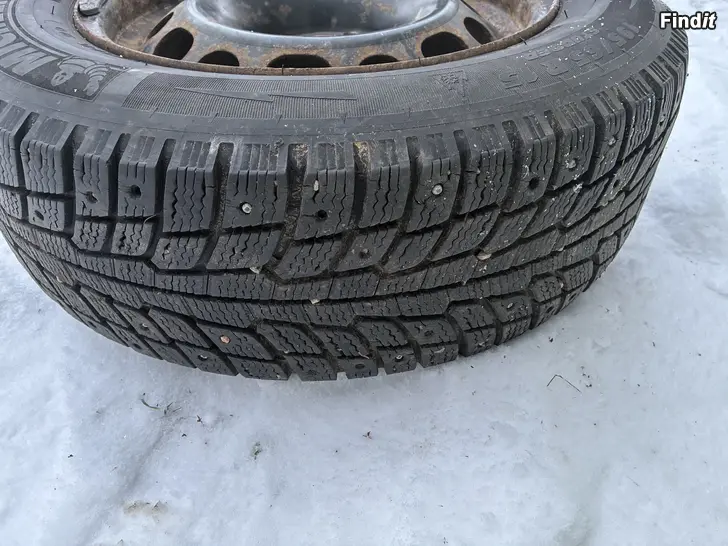 Vinterdäck med dubbar på plåtfälg. 195/65 R 15. Däcken i okej skick, saknas en del dubbar men bra krusor. Däcken kom med bil som blev köpt på sommaren och gick inte att montera på bilen sedan, så jag har inte använt dom själv.