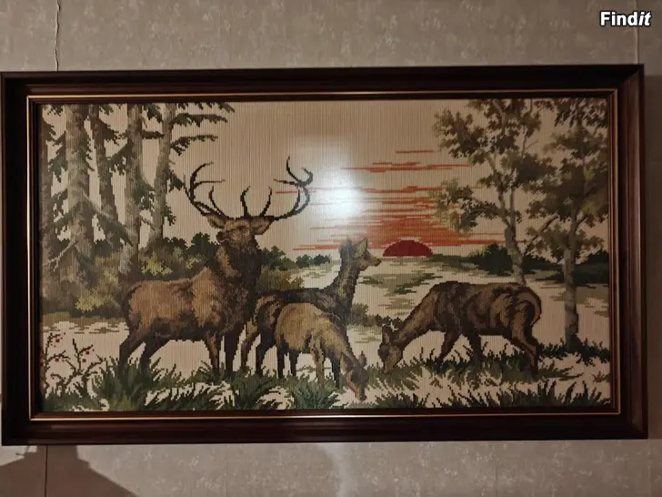 Tavla i korsstygn med Älg-familj Motiv Älg-familj Storlek på tavlan Bredd 124cm Höjd 72cm Inramad och inglasad Pris 100 euro Betalas kontant Hämtas hos mig i Kronoby