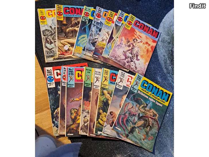 Harvinainen tlaisuus. Kaikki 15 ilmestynyttä CONAN Marvel-lehteä. 1-3/1984 ja 1-12/1985. Kunto erittäin hyvä, 2/84 hintalappu ja vähän kulunut, 2/85 noin neliö cm poissa kansion oikeasta alakulmasta ja vähän kulunut. Nämä lehdet harvoin myynnissä.