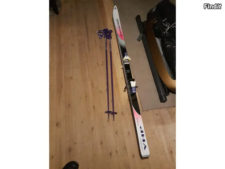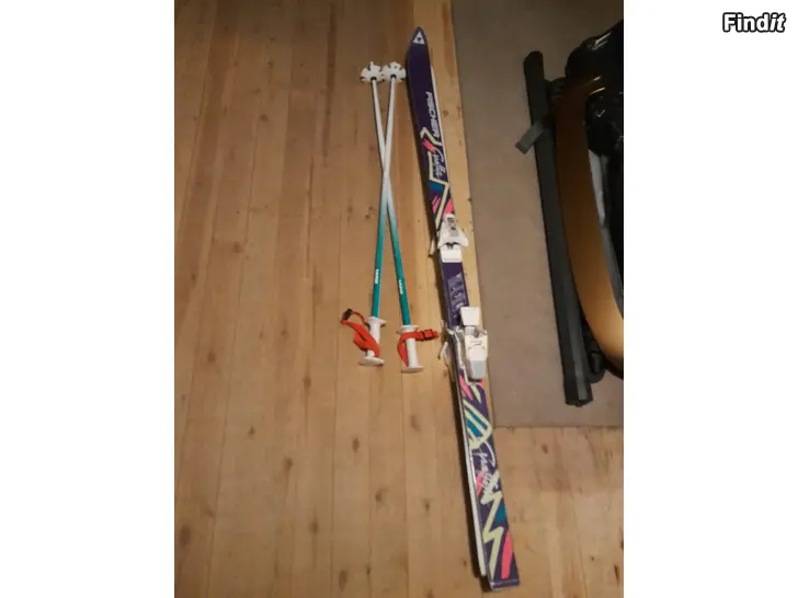 Myytävänä ehjät, hyväkuntoiset, kuvien mukaiset laskettelusukset ja sauvat säilytyspusseineen.