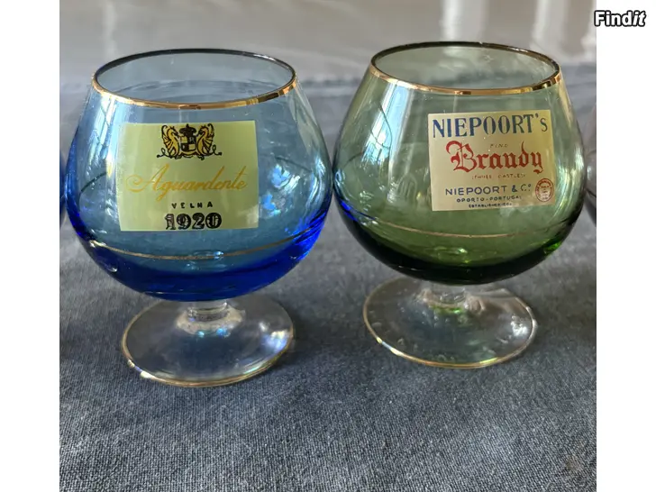 Ett set med brandy/cognac-glas med olika brandy-märken på. I fint skick.