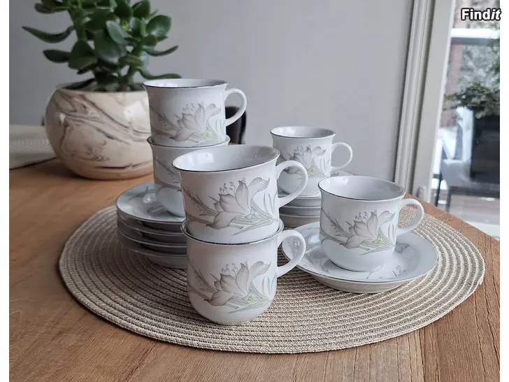 Paket om 6 koppar med 8 fat säljes till paketpris 4 euro. I använt skick så genast redo att fortsätta brukas. Njut av kaffet! Hämtas från Sundom.