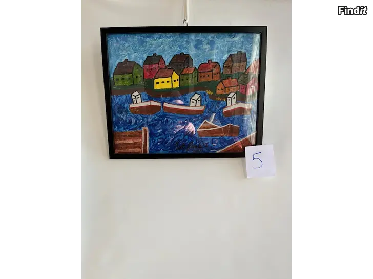 En tavla med motiv av hus och båtar.En charmig målning som föreställer en kustby med båtar på vattnet. Naivistisk utryck. Färgstarka hus och en ljus himmel skapar en glad och inbjudande atmosfär. Akryl på mineralfiberduk. Höjd 42,0 cm. Bredd 52,0 cm, inklusive svart ram. Peter Glennfalk nr 5