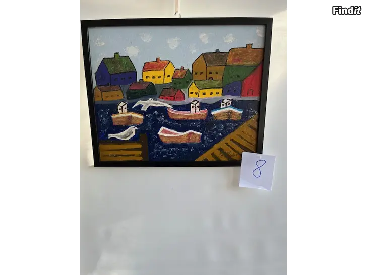 En tavla med motiv av hus och båtar .En charmig målning som föreställer en kustby med båtar på vattnet. Naivistisk utryck. Färgstarka hus och en ljus himmel skapar en glad och inbjudande atmosfär. Olja på mineralfiberduk. Bredd 85 cm Höjd 41,5 cm. Inkl. svart ram. Peter Glennfalk nr 8.
