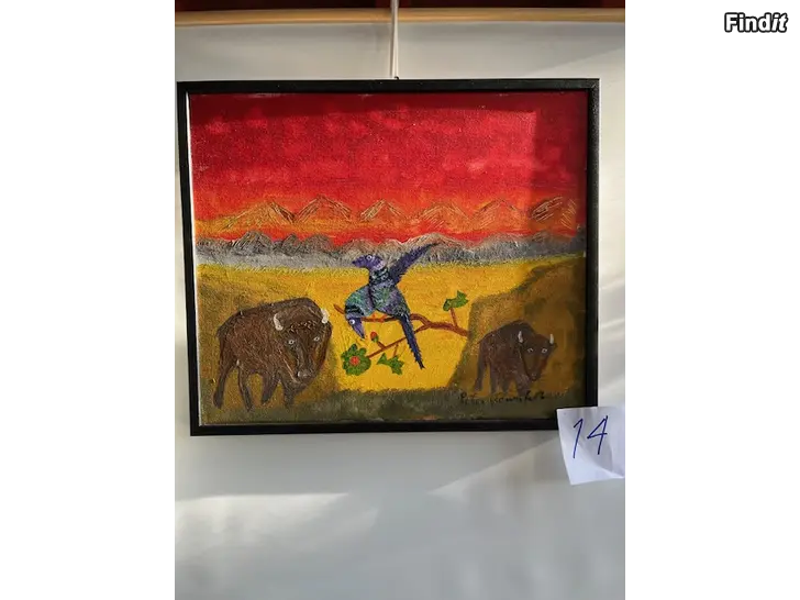 En målning med motiv av bufflar och en fågel. Olja på duk med kilram. Höjd 48,5 Bredd 57 cm inkl. ram . Peter Glennfalk nr 14