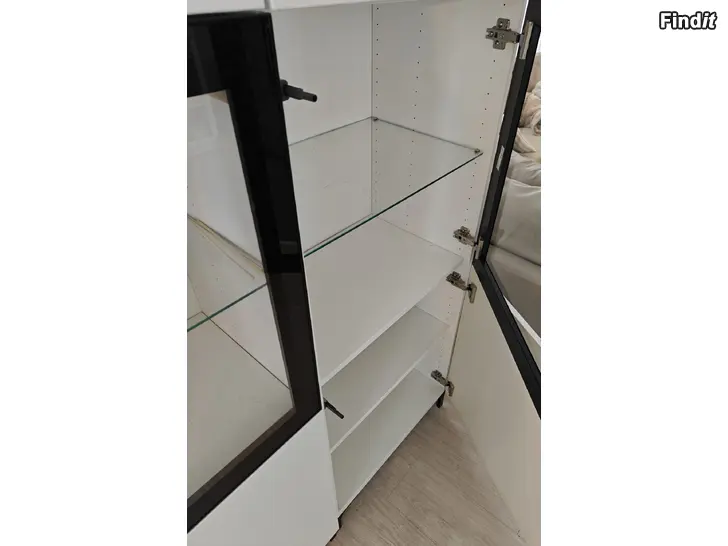 Säljes Ikea bestå vitrinskåp med vita högblanka + svarta/glas skåpluckor.