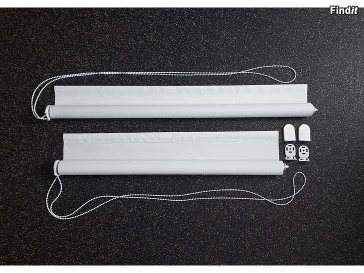 Vita mörkläggningsgardiner med fästen, 80 och 95 cm, säljes för 5 euro styck eller 10 euro tillsammans. Avtorkning lämnas till köparen. Hämtas från Sundom.