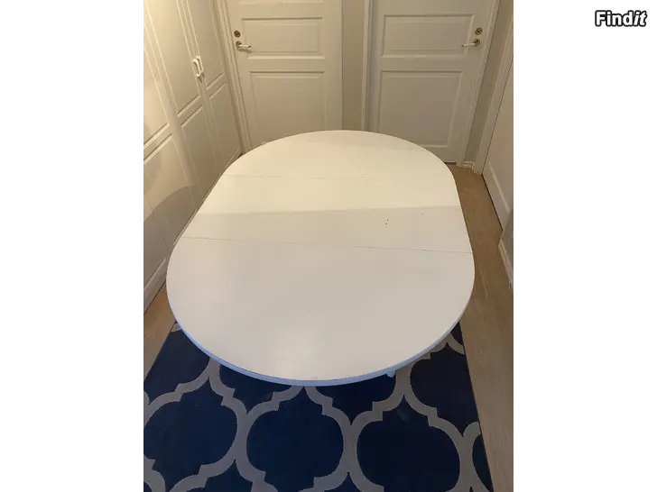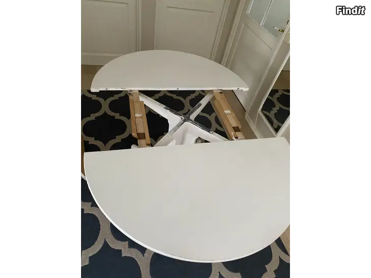 Ett stabilt äldre bord ommålat i vitt. 115cm i diameter utan iläggsskiva. Mått på Iläggsskiva är 50cm.