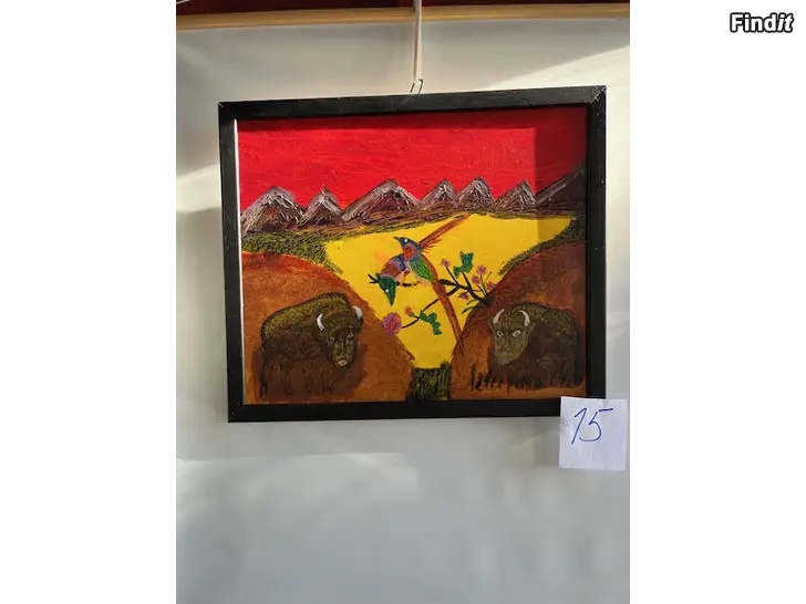 En målning med motiv av bufflar, berg och fåglar. OLJA PÅ DUK. Höjd 48,5 cm. Bredd 57 cm. inkl. ram. Peter Glennfalk nr 15