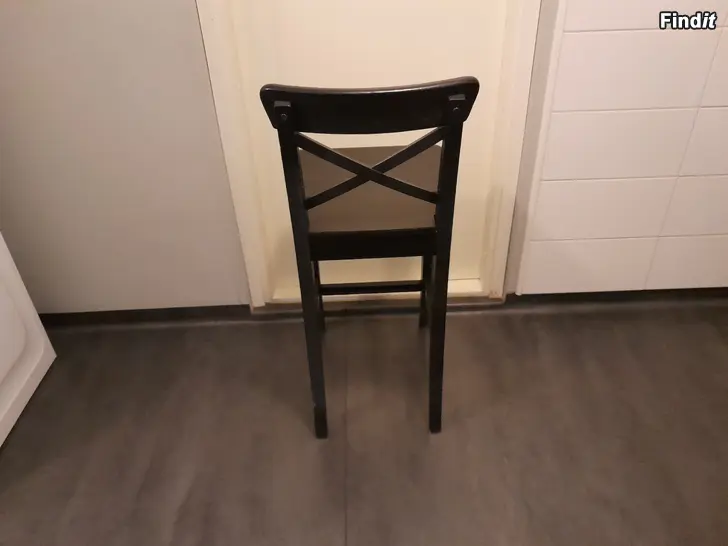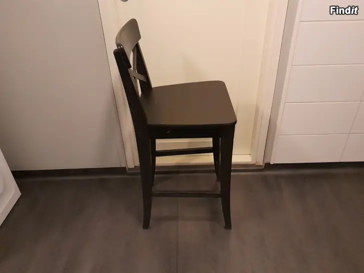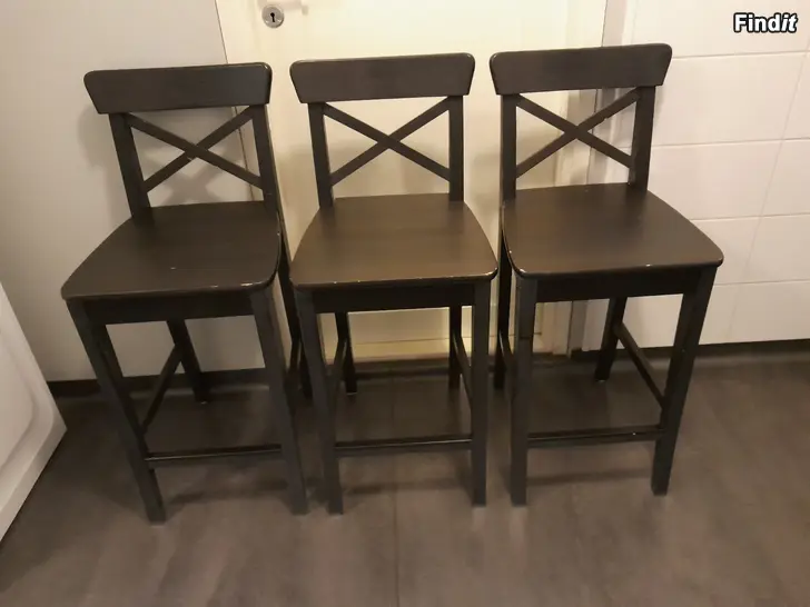 Säljes svarta barstolar i trä. Skavanker finns men är hela. Sitthöjd= 63 cm Sittbredd= 40 cm Tot. djup= 40 cm Tot. höjd= 92 cm 60€ för alla 3st. stolar