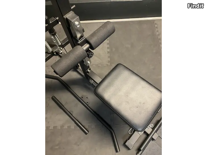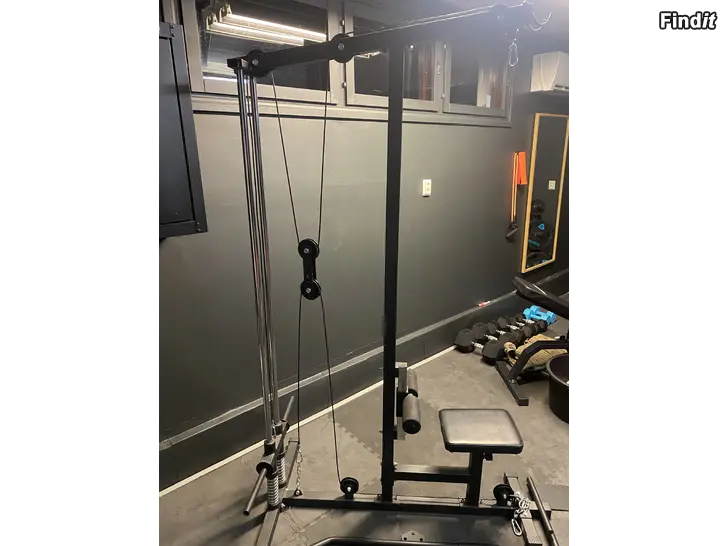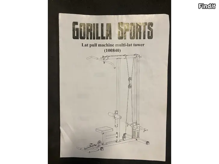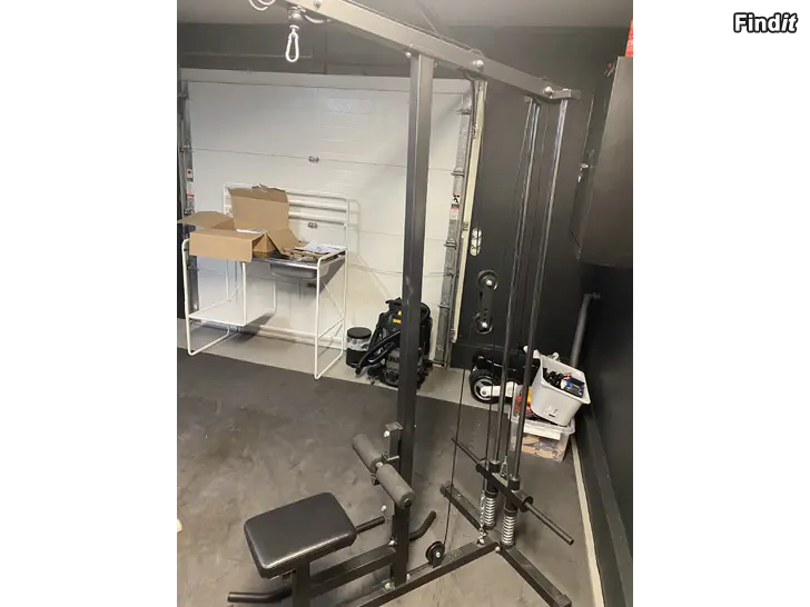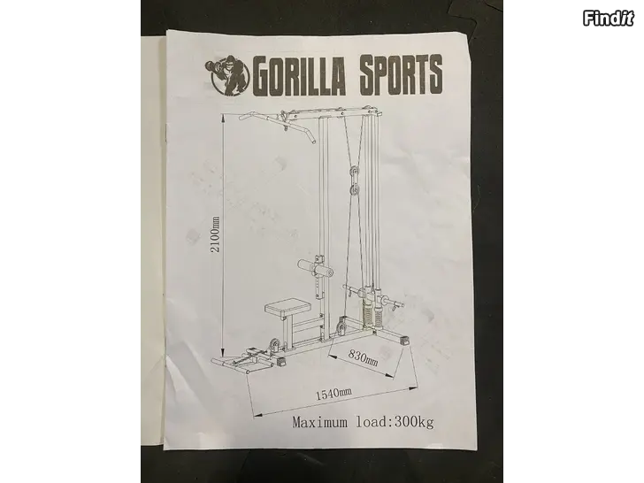 Kabelmaskin upp/ner. Gorilla Sports. Max vikt 300kg. Kolla måtten från bilderna. Passar för vikter med 25mm hål. Olika handtag och stänger kan fästas i maskinen. På köpet kommer en längre böjd stång och en kortare rak. Mycket mångsidig maskin i gott skick.