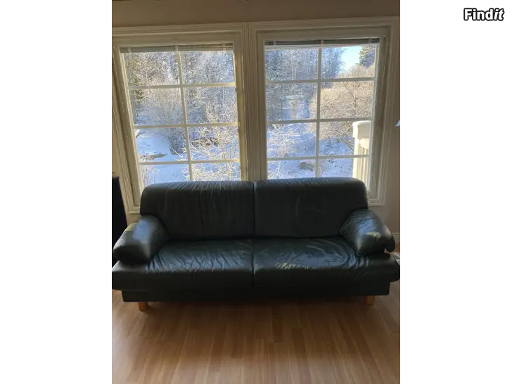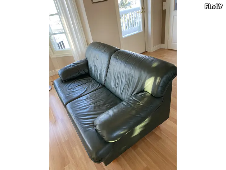Två soffor 3 + 2, i äkta läder i den nu trendiga färgen mörkgrön, säljes. Mått den större ca 210 x 90 cm, den mindre ca 170 x 90 cm. Pris 100 euro för båda eller 50 euro styck.