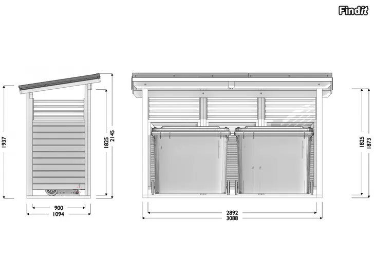 Koteihin sekä taloyhtiöille sopiva jätekatos. Tähän sopii esimerkiksi: -2 kpl 660L Jäteastioita Tai -2 kpl 240L ja 1 kpl 660L jäteastioita Tai -4 kpl 240L Jäteastioita