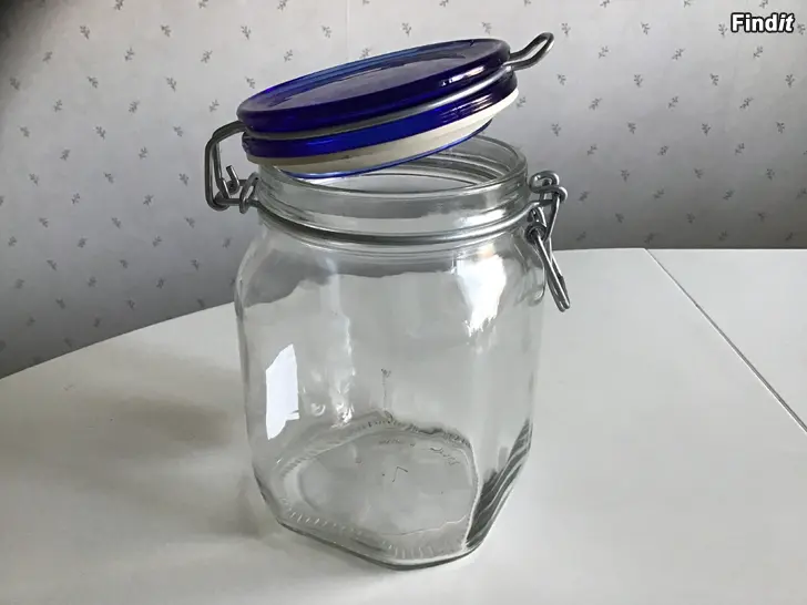 Skåpstädning 1 st glasburk med gummitätningslock, locket i blått glas, 1 liter, pris 2 euro. Säljs som obehövliga. Kontantbetalning. Se även mina övriga annonser.