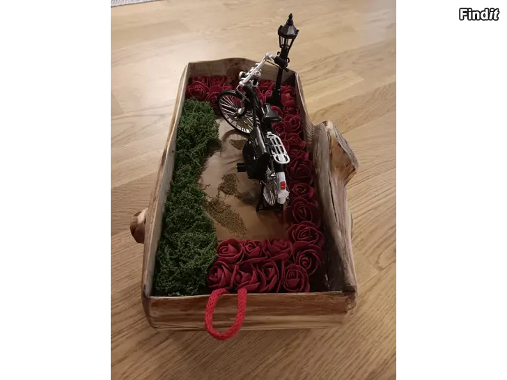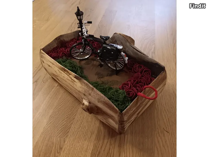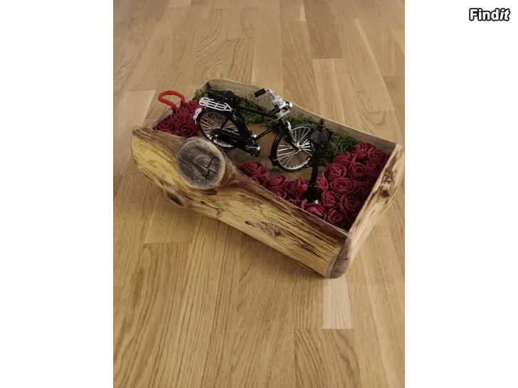 Handgjord blomlåda i äkta trä, ett unikt artesan-hantverk dekorerat med mossa, rosor.