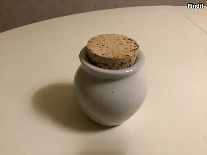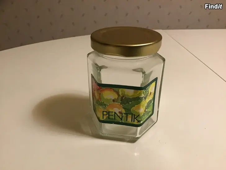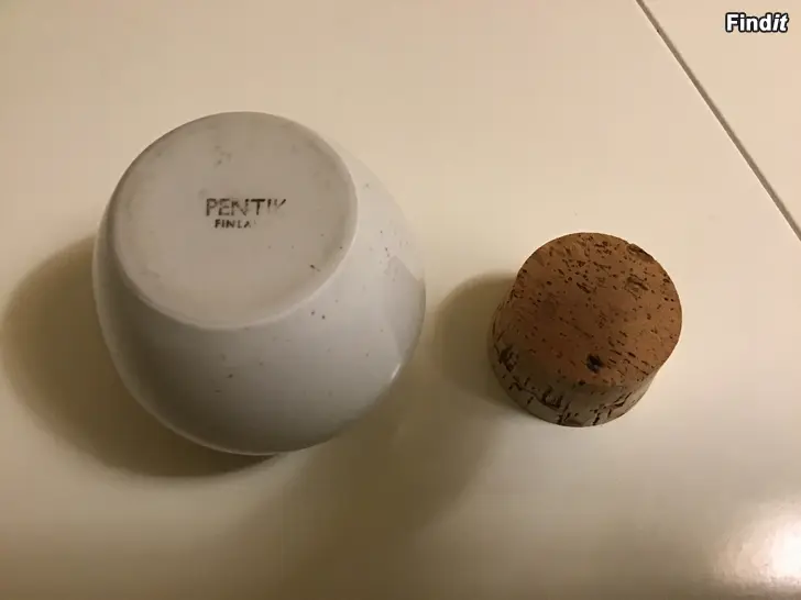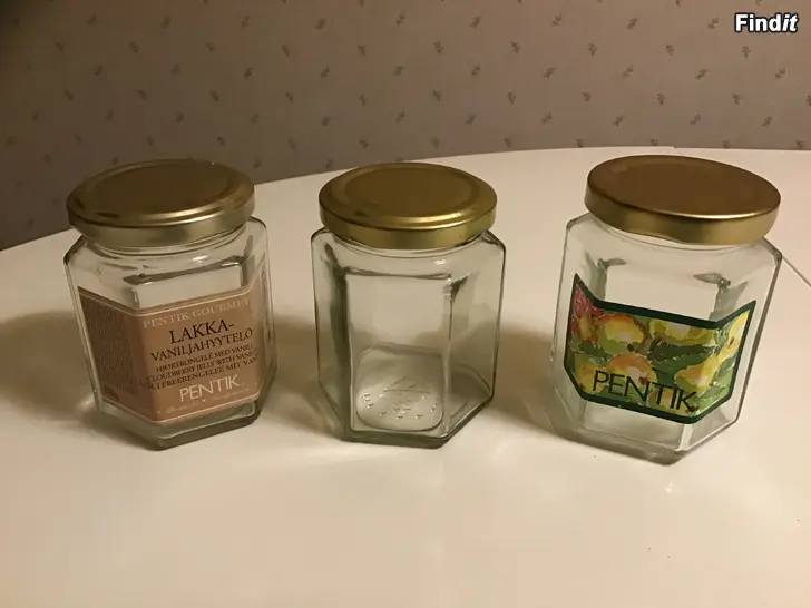 1 st Naturvit Pentik burk med korklock, keramik 3 st 6- kantiga Pentik Glasburkar med guldfärgade metall lock Alla hela och rena, Pris för alla 4 burkarna 5 euro. Kontantbetalning. Se även mina övriga annonser.